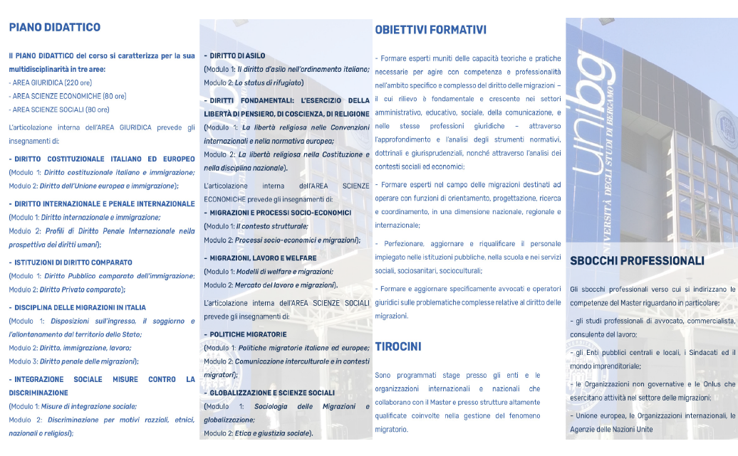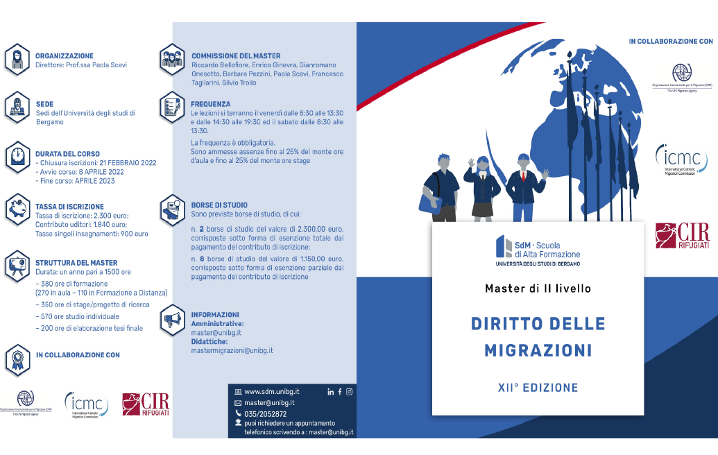 Formare esperti con capacità teoriche e pratiche necessarie per agire con competenza e professionalità nell’ambito specifico e complesso del diritto delle migrazioni. E’ il primo obiettivo del Master di Diritto delle Migrazioni, che nell’Università degli Studi di Bergamo giunge alla XII^ edizione. Definito “un’eccellenza e una ricchezza a livello europeo” dalla Presidente della commissione per la cultura e l’istruzione a Bruxelles, il Master si distingue in ambito nazionale per un solido impianto giuridico e si avvale della collaborazione di importanti organizzazioni internazionali e nazionali: OIM (International Organization for Migration), ICMC (International Catholic Migration Commission) e CIR (Consiglio Italiano per i Rifugiati). Le iscrizioni sono aperte e si chiuderanno il 21 febbraio, per avviare il Corso l’8 aprile. Sono messe in palio dieci Borse di studio per studenti meritevoli. La durata è di un anno, con lezioni che si terranno al venerdì dalle 8.30 alle 19.30 ed al sabato dalle 8.30 alle 13.30.